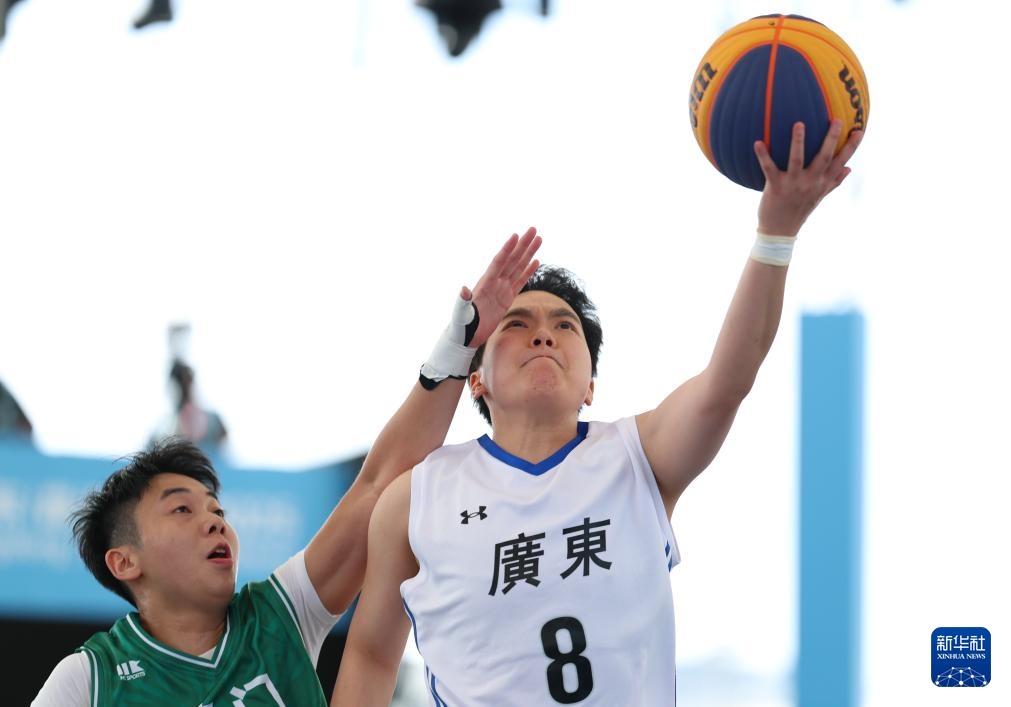 11月12日,广东队球员周粤明(右)在比赛中上篮得分。当日,在澳门举行的第十五届全国锦标赛三人女篮比赛中,广东队以21比3击败澳门队。新华社记者 孙凡跃 供图